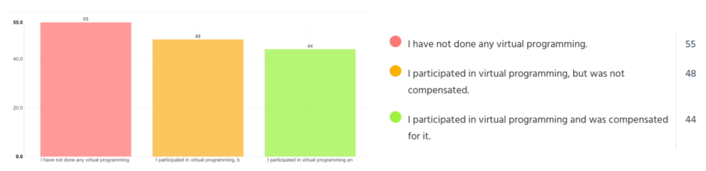 Virtual programming is an opportunity for orchestras and ensembles to put on concerts and shows without the risk of a live audience. These groups had to cancel the remainder of their season before the summer, and virtual programming and live streams can provide a means of starting a new season in the fall. One benefit of virtual programming is that audiences from all over the world can tune in, increasing the accessibility of performances and allowing orchestras to have greater exposure. However, with so many orchestras turning to virtual programming, smaller and less mainstream ensembles may have trouble retaining enough audience members to generate significant revenue, and these ensembles are the most likely to suffer from greater financial ramifications. Only 34% of respondents indicated that at one point, they have participated in virtual programming and were compensated for it, while 37% of respondents indicated that at one point, they have participated in virtual programming and were not compensated for it.