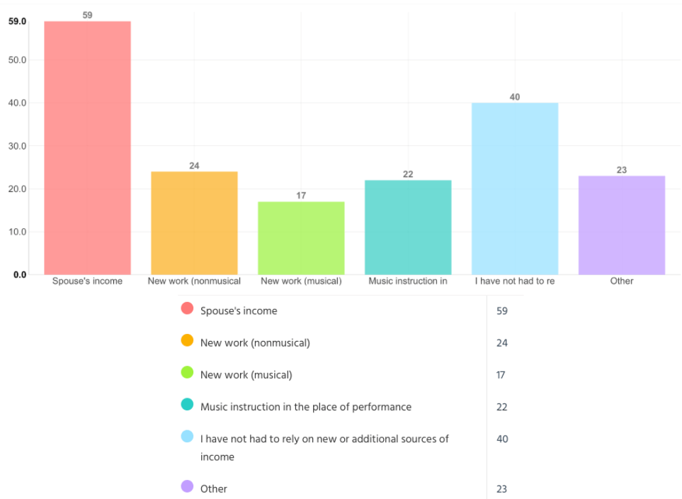 31% of respondents reported that none of their pre-pandemic income streams remained stable. Most of the respondents that indicated this listed some combination of orchestral musician, member of an ensemble, and freelance work as their stable, pre-pandemic incomes. These are the types of workers that are hit the hardest, because they rely on an audience to receive revenue. Almost every musician in the survey who listed only freelance work as a pre-pandemic music stream of income reported that none of their pre-pandemic income streams remained stable.